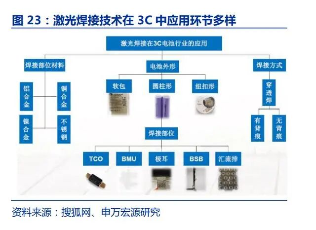 激光焊接设备可应用于电芯、模组焊接生产等环节。动力电池按照包装形式可以分为方形电池、圆柱电池、软包电池。以目前市场主流电池形态——方形电池举例,激光焊接工艺应用于:1)结构件制造环节:正负极极柱焊接、防爆阀焊接;2)电芯生产环节:顶盖焊接、密封钉焊接、转接片焊接等环节;3)模组环节:Busbar、采集线、侧板焊接等。