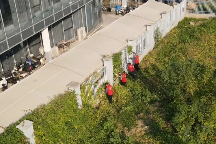 志愿者们用专业的铲刀、玻璃擦、玻璃水、地刷等工具清洁玻璃和地面,不怕苦、不怕脏。而负责割草的党员们在栏杆外围,用镰刀一点点割去缠绕的树藤,恢复了整排护栏的整洁。