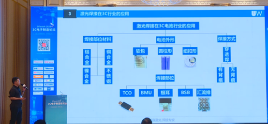 随后田学娜分享了激光焊接和UW激光焊接在3C电池和3C电子行业应用。激光焊接在3C电池行业广泛应用于TCO、BMU、极耳、BSB、汇流排等部位,多焊接铝合金、铜合金、镍合金、不锈钢等材料。