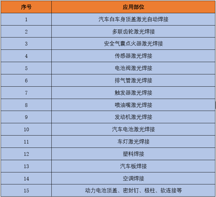 图表 3 激光自熔焊在汽车工业的应用