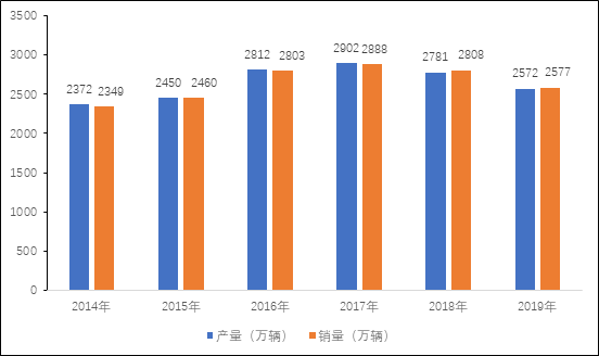 图表 5 2014-2019年中国汽车产销量情况