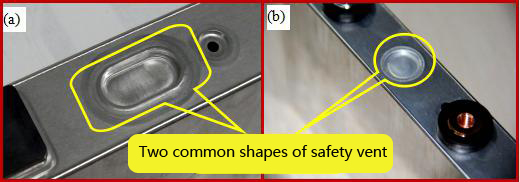 安全阀是密封板上的薄壁阀体。当电池内压超过规定值时,安全阀将破裂,为电池提供保护。结构巧妙,许多安全通风口是电池制造商的专利设计。它的基本原理是使用激光焊接两个固定的铝金属板。当内压超过一定值时,铝片会在凹槽内开裂,防止电池爆裂。因此,该工艺对激光焊接工艺的技术要求很高,必须使焊缝密封良好。此外,焊缝的断裂压力应大于铝板坡口的断裂压力。下图 8 显示了两种常见的安全通风口