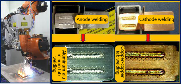 盖板上的电池极柱有内外连接:在电池内部,电芯极耳和极柱之间进行焊接。在电池外部,电池极柱通过连接器焊接形成串联电路和并联电路,构成电池模块。Tab为电池正负极,铝为阳极,铜为阴极。根据电池型号不同,铝(铜)极耳的尺寸也不同。在满足拉力和电导率设计要求的前提下,优先选用激光光束质量好、光斑小的光纤激光器。图 10 显示了光纤激光焊接、铝之间和铜之间电池片的激光焊接。