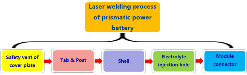 这三种电池目前都用于电动汽车的生产中,其中棱柱形电池和圆柱形电池应用比较广泛。不同形状的动力电池具有不同的焊接工艺参数。特斯拉电动汽车就是一个很好的例子。它采用电池组结合7000多片松下NCR 18650 3100mah,确保电池寿命长。此外,中国市场上最畅销的电动汽车比亚迪王朝系列只是电池组与铝壳棱柱形电池组合的另一个例子。方形动力电池激光焊接工艺流程如图4所示。