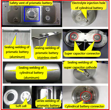 动力电池有六个激光焊接位置,即盖板安全口、电芯&极柱、电池壳、密封销(电解液注入孔)、电池极耳、电芯极耳和顶盖。此外,超级电容器的焊接位置主要是连接器和阴极(封焊)。超级电容器和不同类型动力电池的激光焊接位置如图5所示