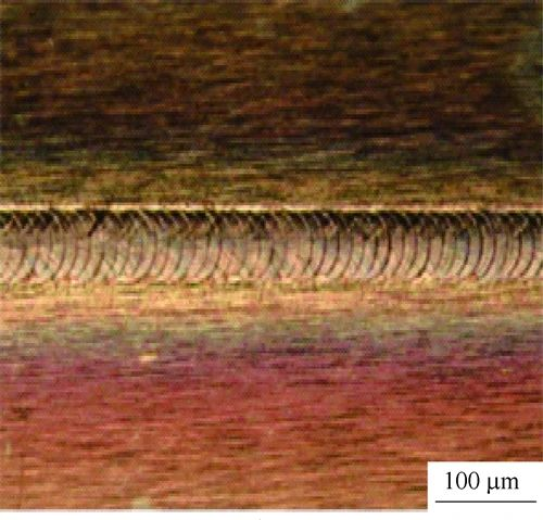 3)图9显示了用100W蓝光激光器搭接焊接铜箔的结果。在3张铜箔以30μm厚度堆叠的状态下,以约10mm/s的速度从顶部表面用激光扫描铜箔。由于芯径为100μm的光纤输出以1∶1的投影比集中,因此样品表面的激光光斑直径也为100μm,获得了良好的焊接质量,抑制了热量对碎屑和周围环境的影响。