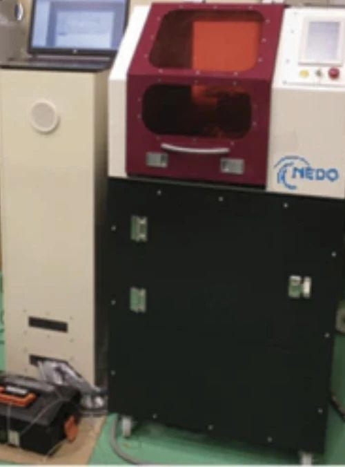 4)图10显示了3D打印机的示例,该打印机能够采用大阪大学开发的蓝光半导体激光器制成纯铜。在粉末床上实现了100μm的激光聚焦光斑直径,可以层压具有高电导率和高热导率的纯铜,在此之前很难用近红外激光熔化,预计该技术将应用于航空航天和电动汽车等工业领域。
