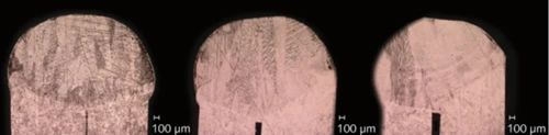 5)更大的渗透深度也开辟了电动汽车应用领域,电动汽车制造商正在转向采用棒状绕组设计,以最大程度地提高热效率和电效率,这三种蓝色激光发夹式焊缝显示出一致的质量,这对于提高生产效率至关重要,如图11所示。蓝色激光可以产生发夹式焊接,这对于高密度高强度的电动机制造很重要。