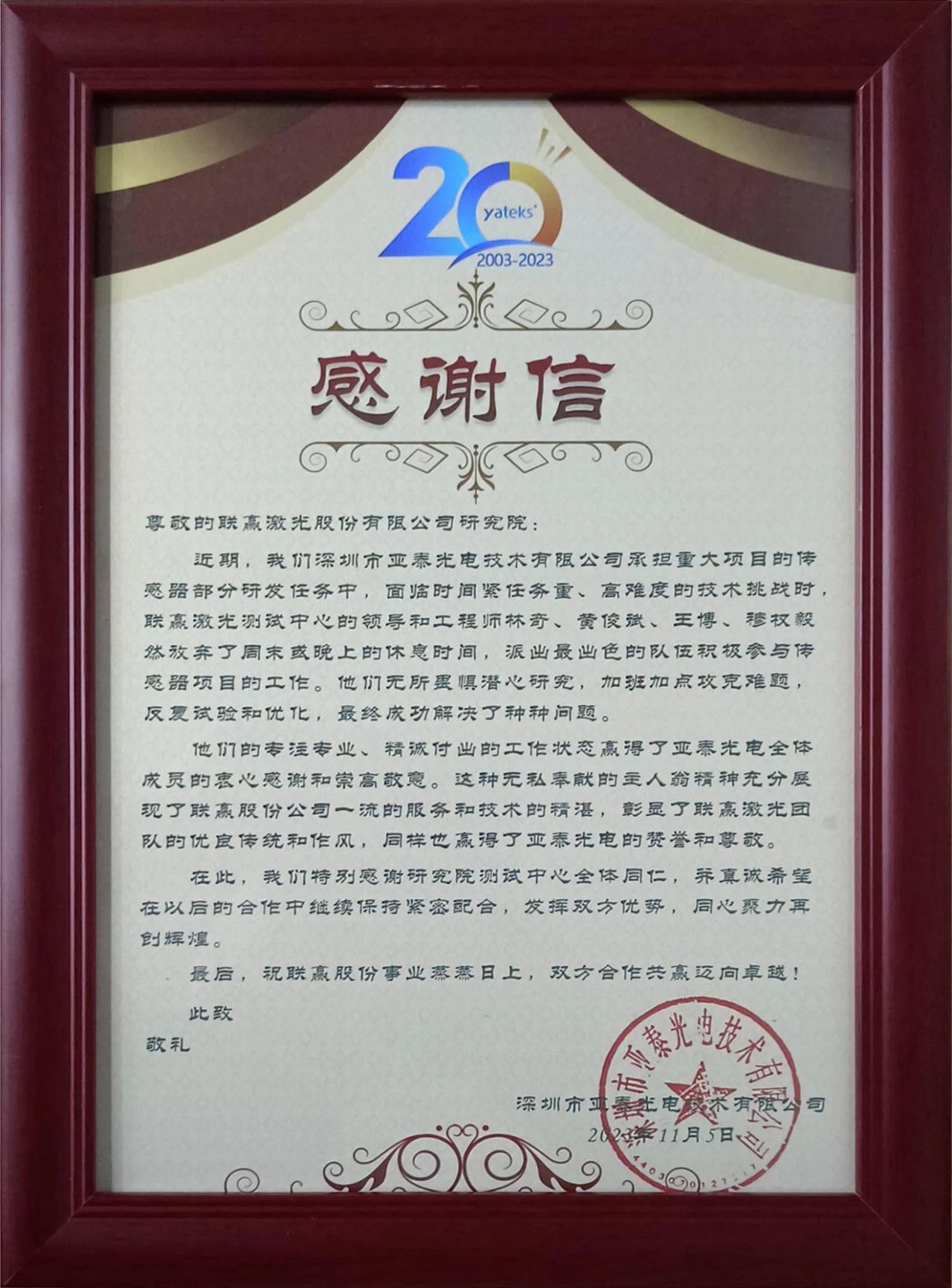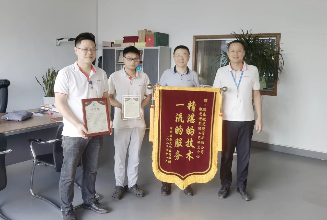近日,乐鱼(集团)体育科技股份有限公司网站激光研究院收到了一封来自深圳市亚泰光电技术有限公司热情洋溢的感谢信,对我司激光研究院工艺研发中心团队的全力支持和协助,以及他们专注专业、精诚付出的工作精神,认真勤勉、爱岗敬业的服务态度表示了诚挚的感谢与高度的赞扬,并表示愿与乐鱼leyu激光在今后的合作中同心聚力、再创辉煌!