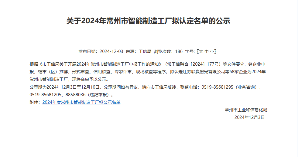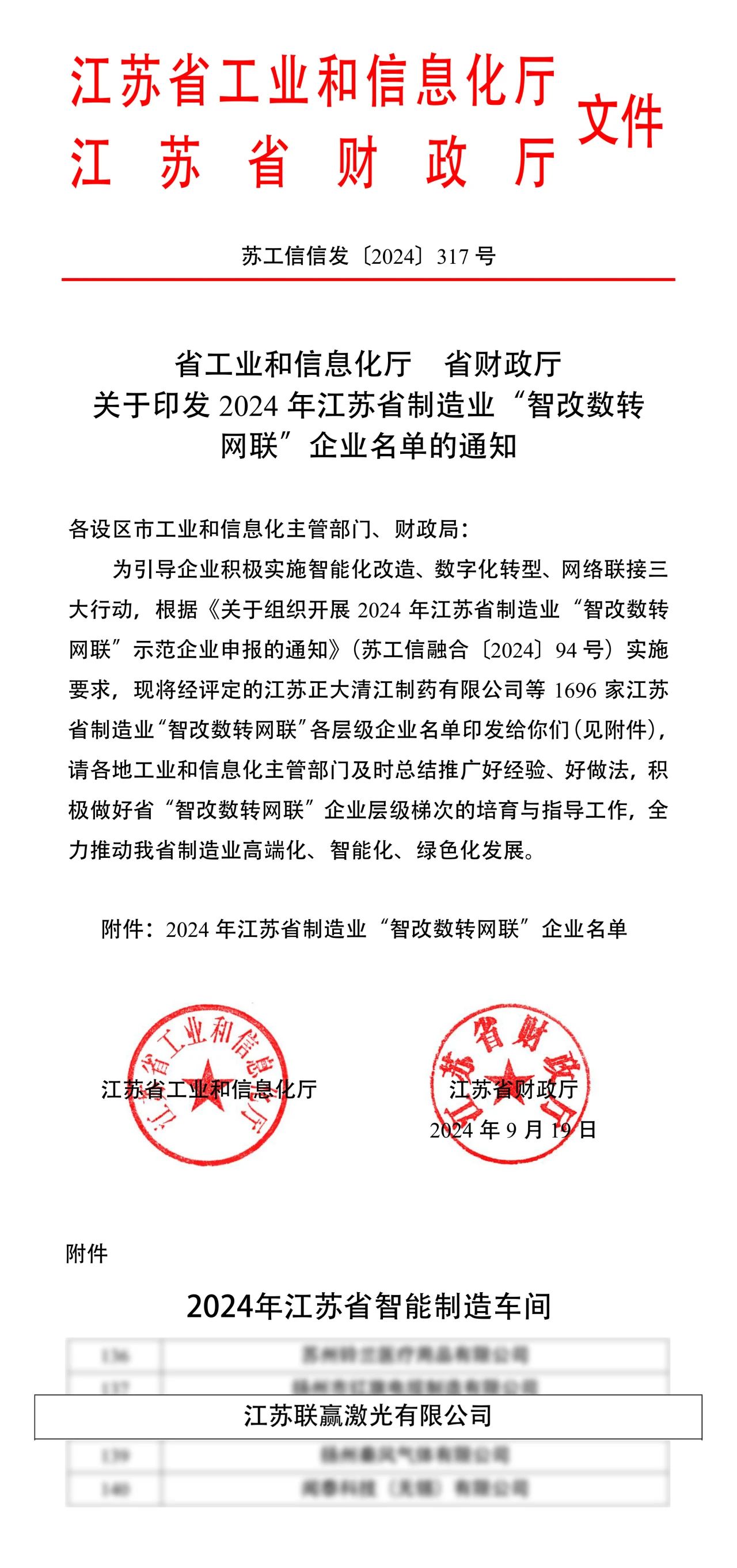 近日,江苏省工业和信息化厅正式公布了2024年度江苏省智能制造车间名单,江苏乐鱼leyu激光有限公司凭借其出色的智能化改造和数字化转型成果,成功入选“江苏省智能制造车间”,这是江苏乐鱼leyu自2023年首次获评“江苏省智能制造车间”以来,第二次获此殊荣!同时,江苏乐鱼leyu凭借卓越的智能制造实力,成功获评“常州市智能制造工厂”认定