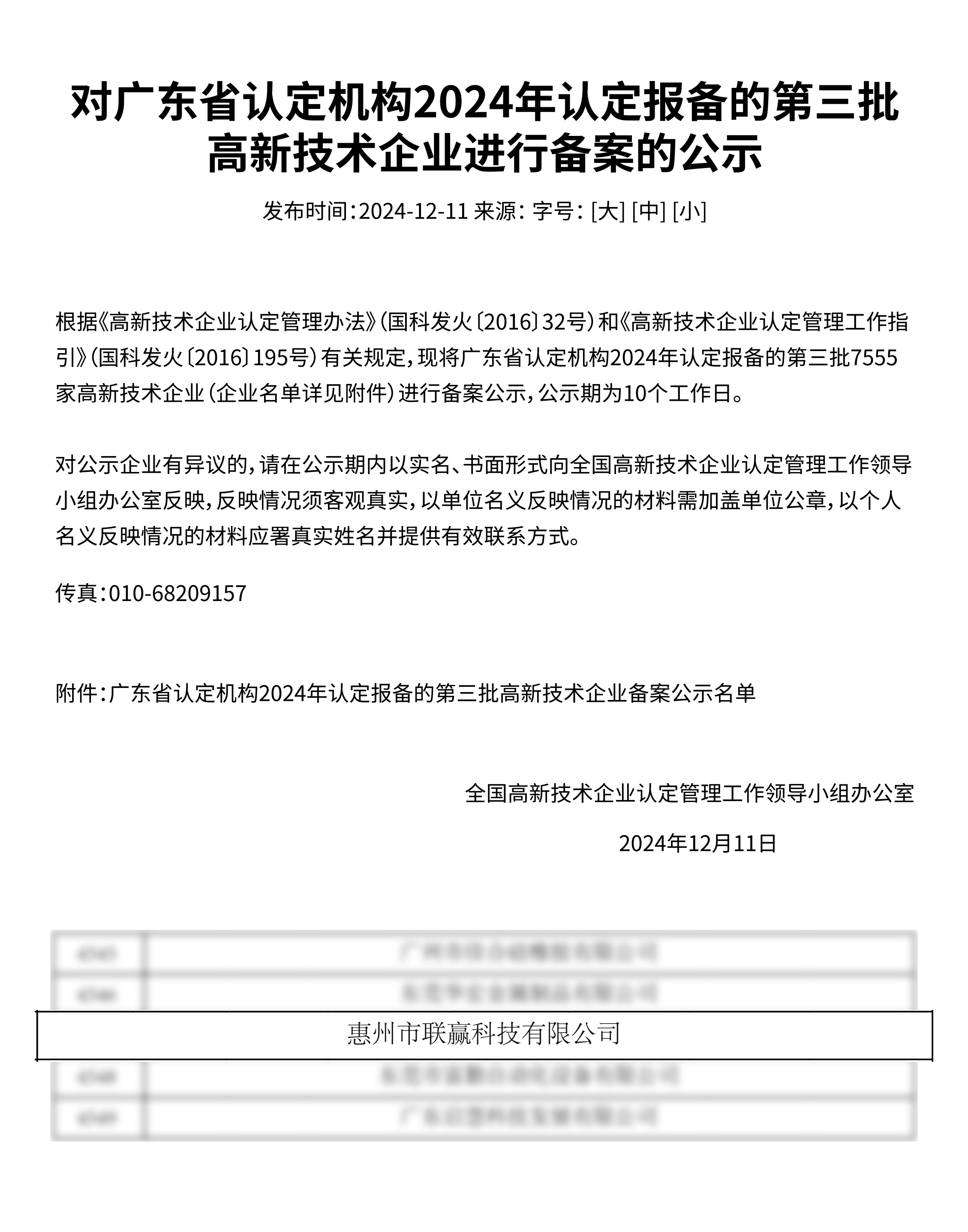 2024年12月11日,根据国家科技部、财政部、税务总局联合发布的《高新技术企业认定管理办法》(国科发火〔2016〕32号)及《高新技术企业认定管理工作指引》(国科发火〔2016〕195号)的严格标准,全国高新技术企业认定管理工作领导小组办公室发布《对广东省认定机构2024年认定报备的第三批高新技术企业进行备案的公告》,经评定公示,惠州市乐鱼leyu科技有限公司凭借行业的卓越贡献与持续创新能力,正式通过国家高新技术企业认定!